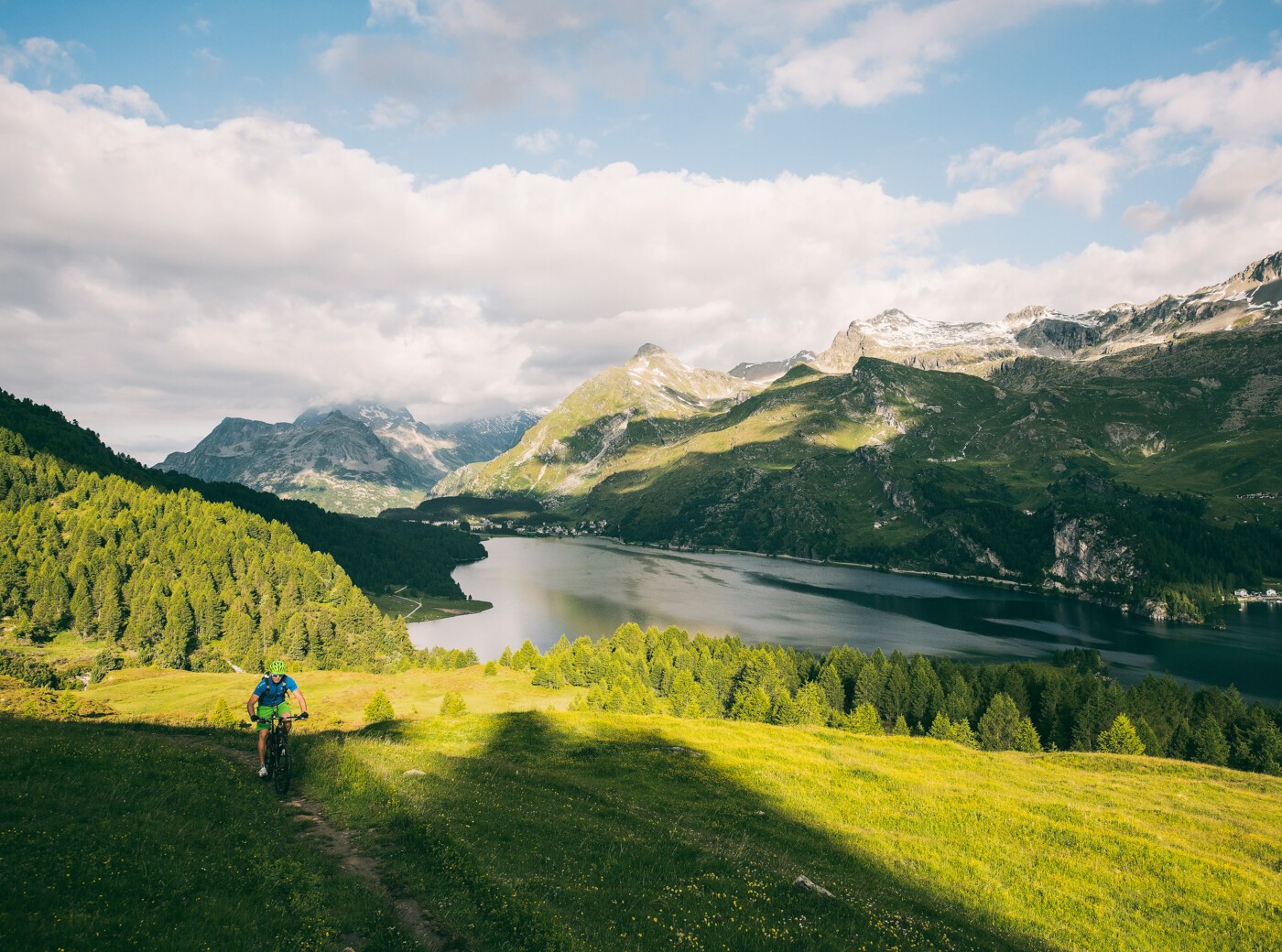 Türkis, Smaragdgrün oder Tiefblau: Die Wanderung rund um den Silsersee begeistert mit ihrem Farbenspiel. Rund um den ganzen See sind es 16 einzigartige Kilometer durch Wälder und über Wiesen. Die Wanderungen können gut in Etappen begangen werden.