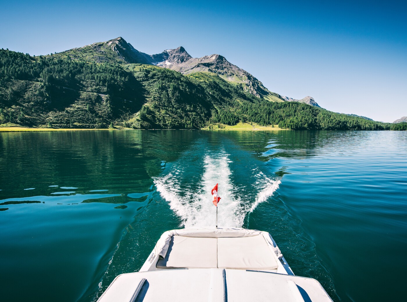 Steigen Sie ein: Die höchstgelegene Kursschifflinie Europas bringt Sie in 40 Minuten von Sils Maria nach Maloja. Unser Kursschiff ist das einzige Motorboot, das den Silsersee regelmässig befahren darf. Aus- oder Zusteigen: Beim Bootshaus in Sils Maria, bei der Halbinsel Chastè, der Ortschaft Plaun da Lej und dem Weiler Isola oder in Maloja. Warum unsere Bergwelt nicht auf dem Wasserweg kennenlernen? Die Gipfel der Margna, des Piz Lagrev des Piz Grevasalvas und des Piz Lunghin ziehen majestätisch an Ihnen vorbei.