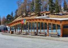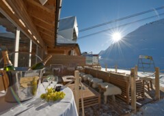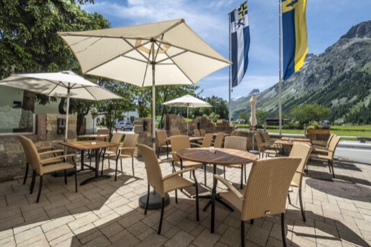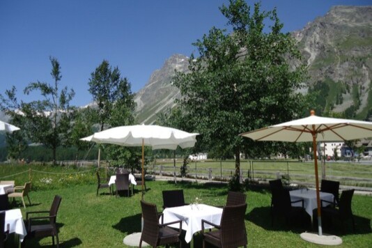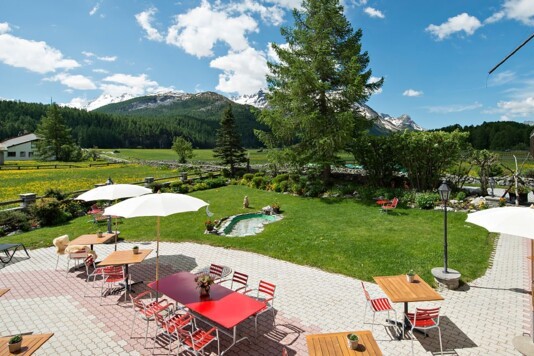 Auf der windgeschützten Sonnenterrasse können Sie sich von der Engadiner Sonne verwöhnen lassen, während ihre Kinder auf dem Spielplatz oder im Kinderspielzimmer spielen.
