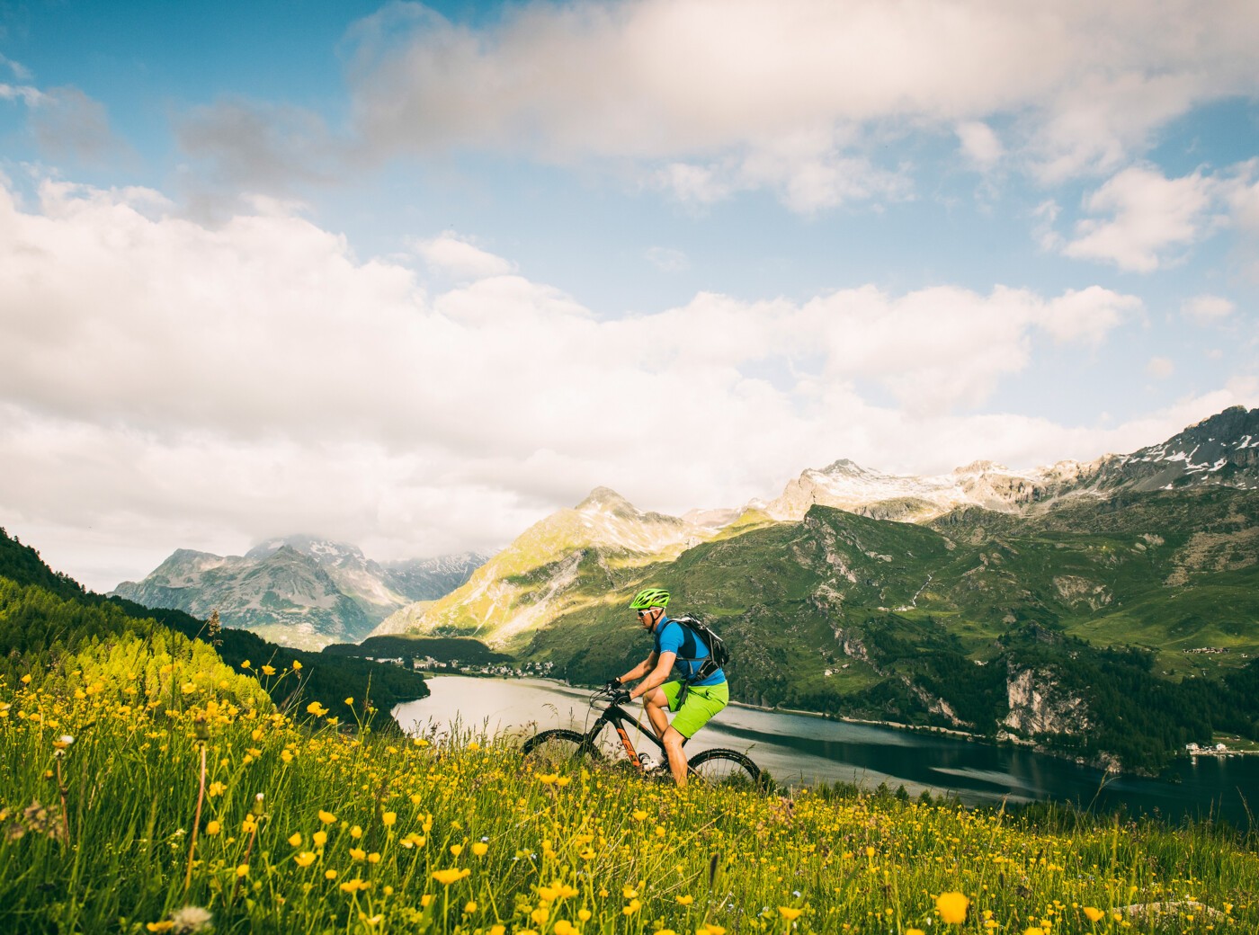 Erleben Sie eine einmalige Bikeroute hoch über dem Silsersee. Die Alpine Bike Route Nr. 1 führt quer durch die Schweiz. Eine Teilstrecke davon führt ab Sils (hinter der Furtschellas Talstation) hoch über die Alp Prasüra, Vanchera, durchquert kurz das Val Fex bei Fex Platta, dann ins Val Fedoz nach Petpreir, Ca d’Starnam, bevor es runtergeht in Richtung Maloja. Und wer noch mehr erleben will, fährt weiter zum Lac da Cavloc, bevor es auf dem gleichen Weg zurückgeht. Nicht allzu anspruchsvoll, aber doch nicht zu unterschätzten. Einmaliger Ausblick auf den Silsersee.