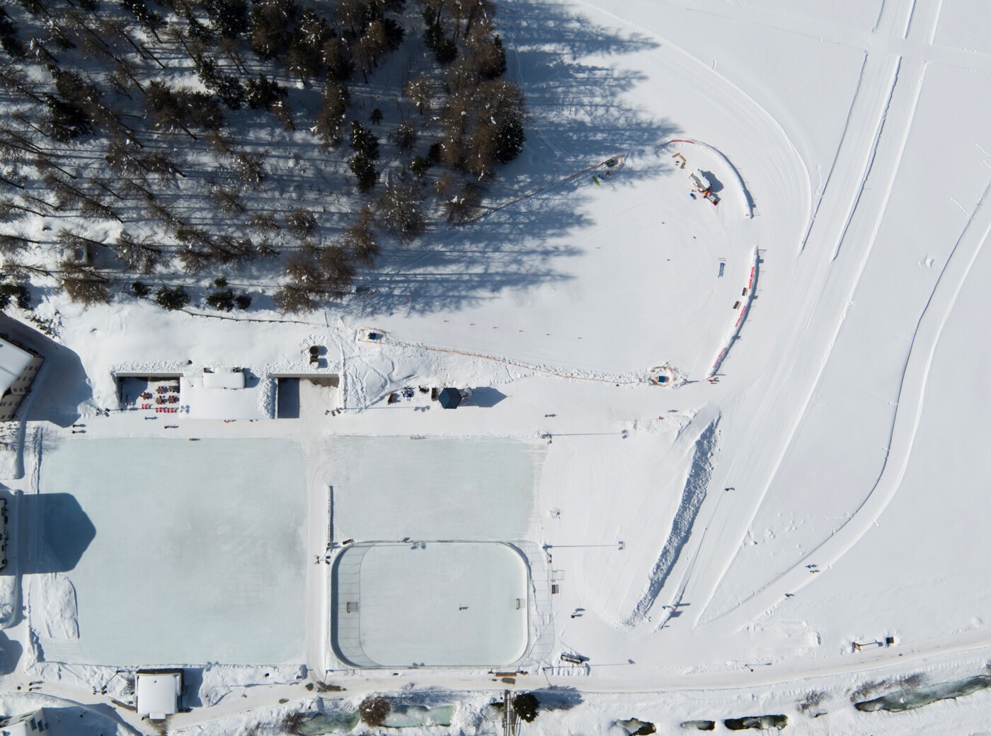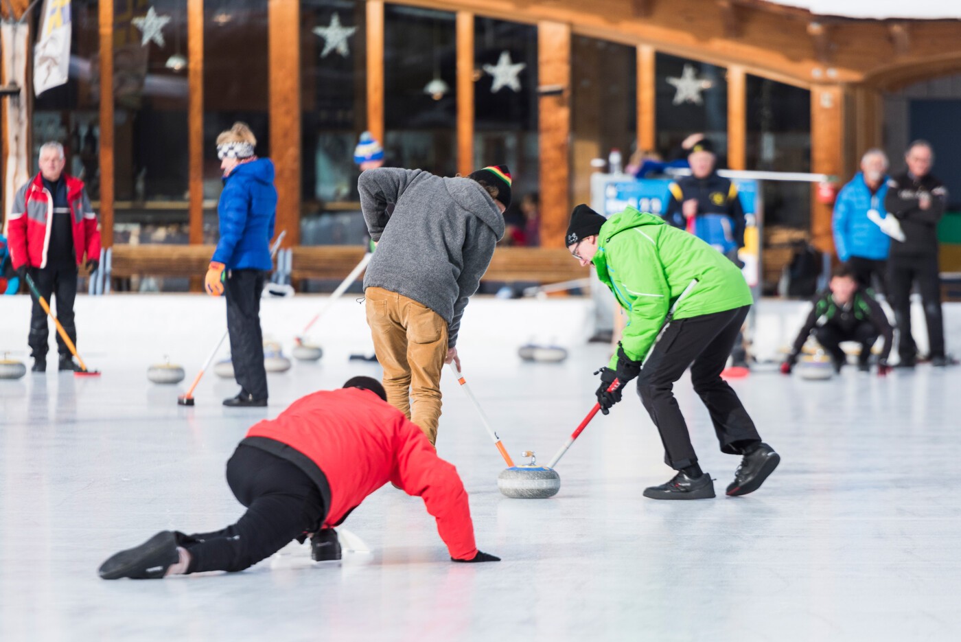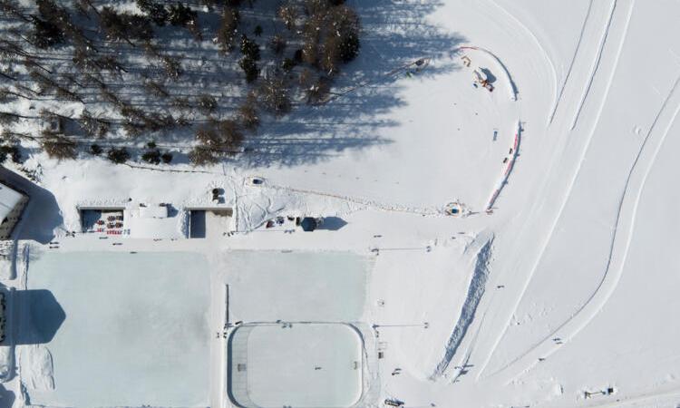 Von Dezember bis Februar werden je nach Eisverhältnissen Curling-Rinks auf dem Eisplatz Muot Marias gezeichnet.
