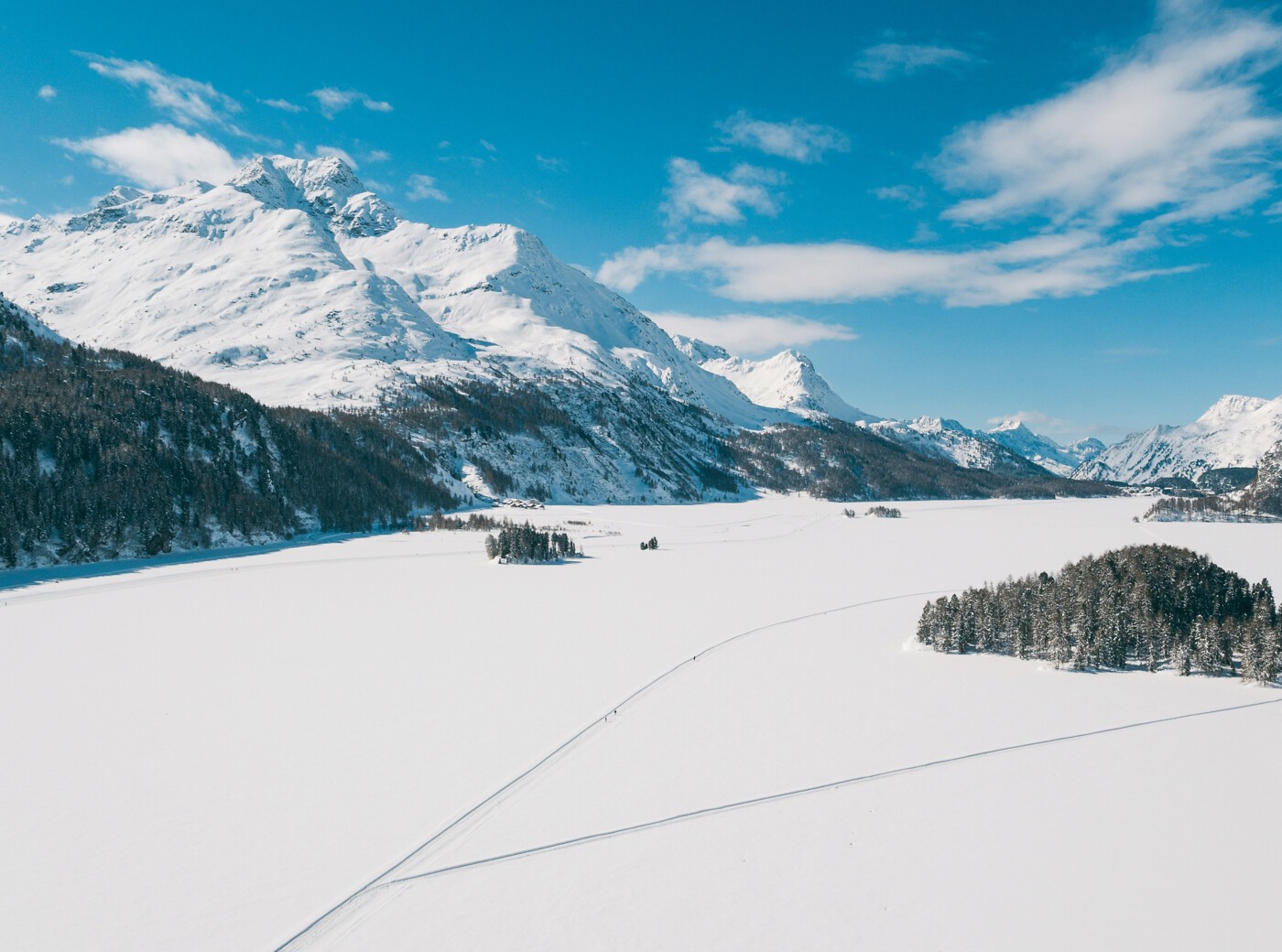 Die einfache, circa 4 Kilometer lange Route Suot Ovas ist flach und eignet sich bestens für Familien und Anfänger. Die Route führt über verschneite Weiden und lichte Lärchenwäldchen via Traunter Ovas an den Silvaplanersee und via Crotschas zurück nach Sils Maria. Auf halbem Weg im Beach Club können Sie sich mit einem warmen Getränk oder einer leckeren Pizza stärken.