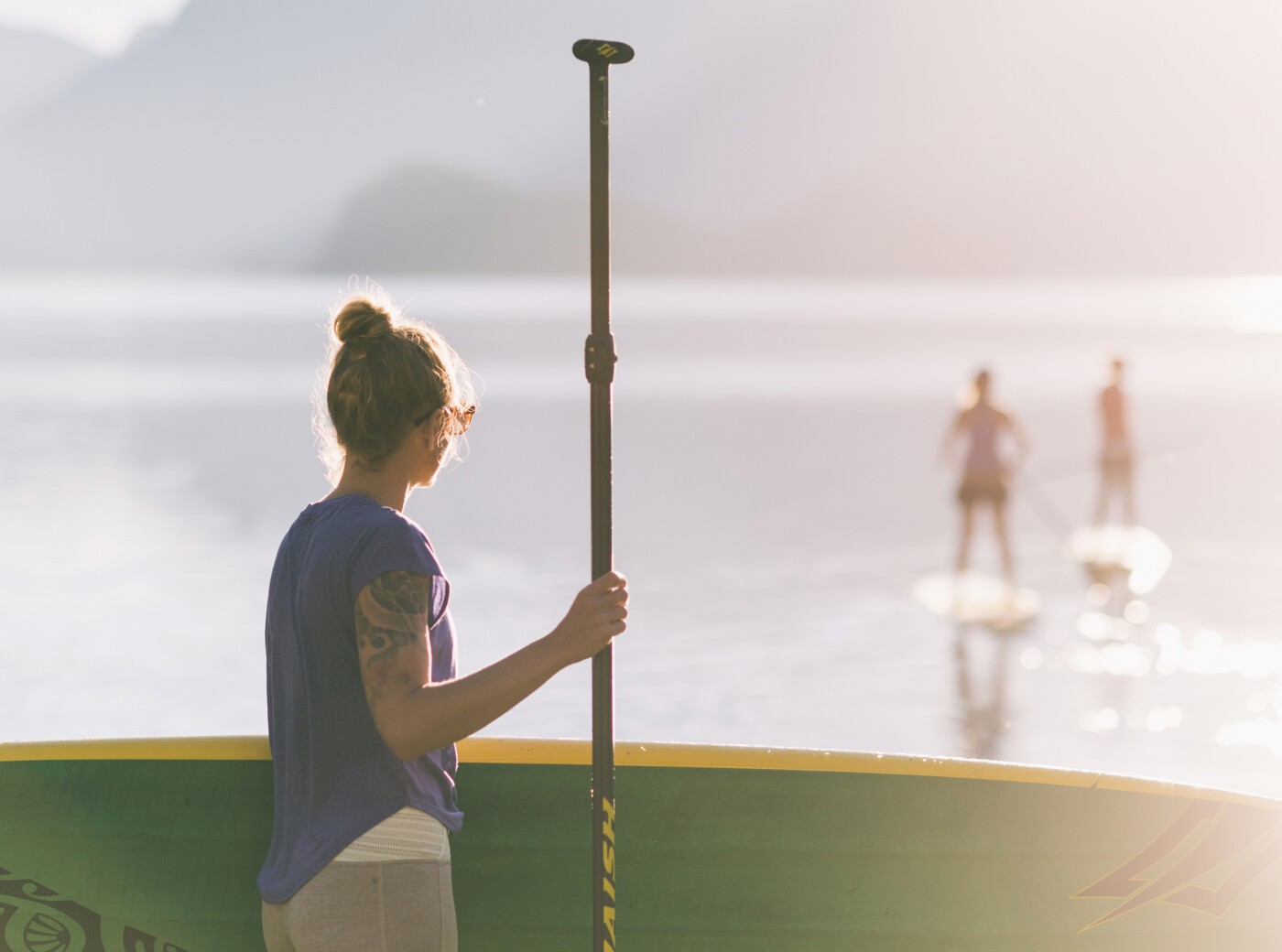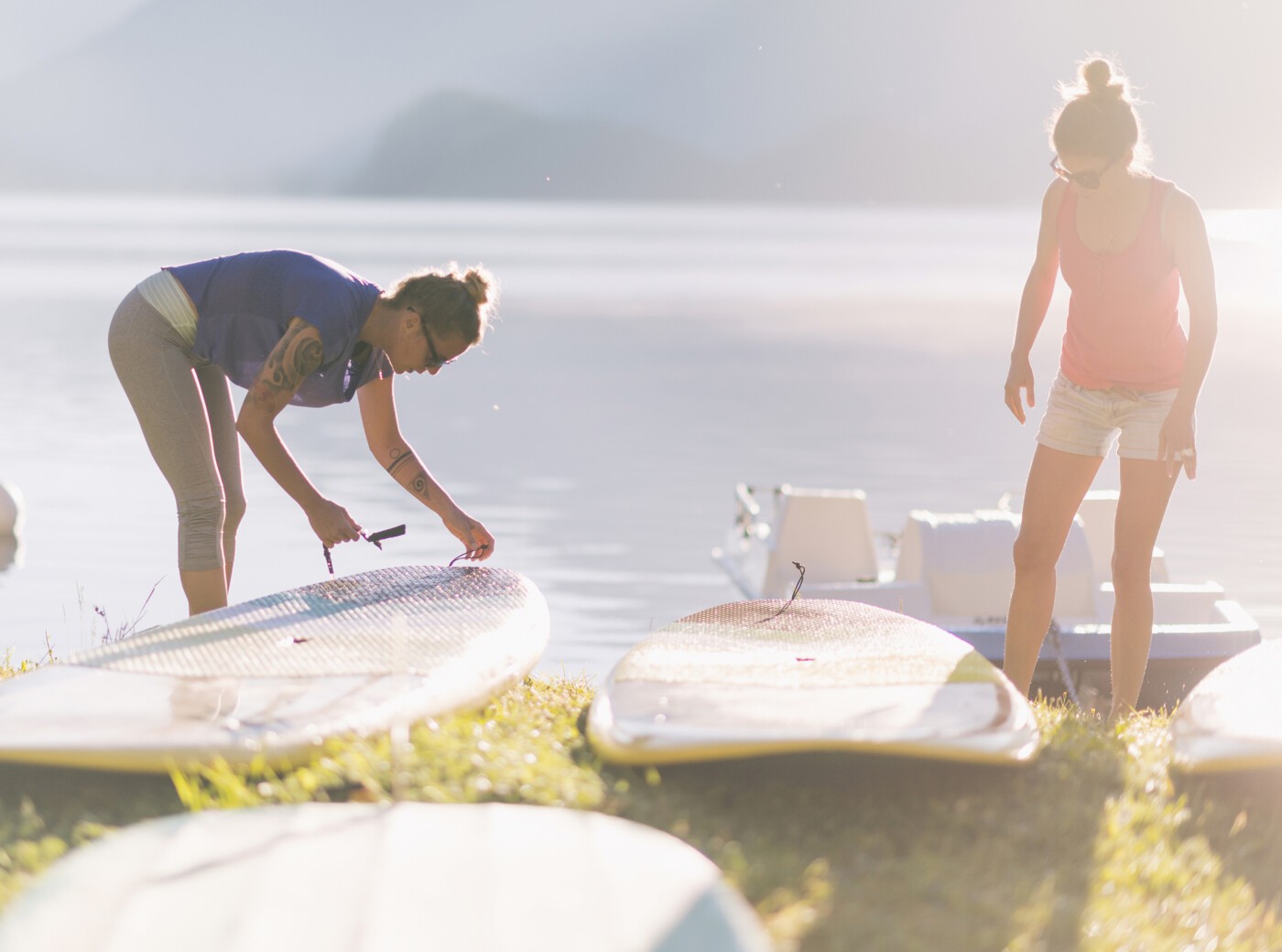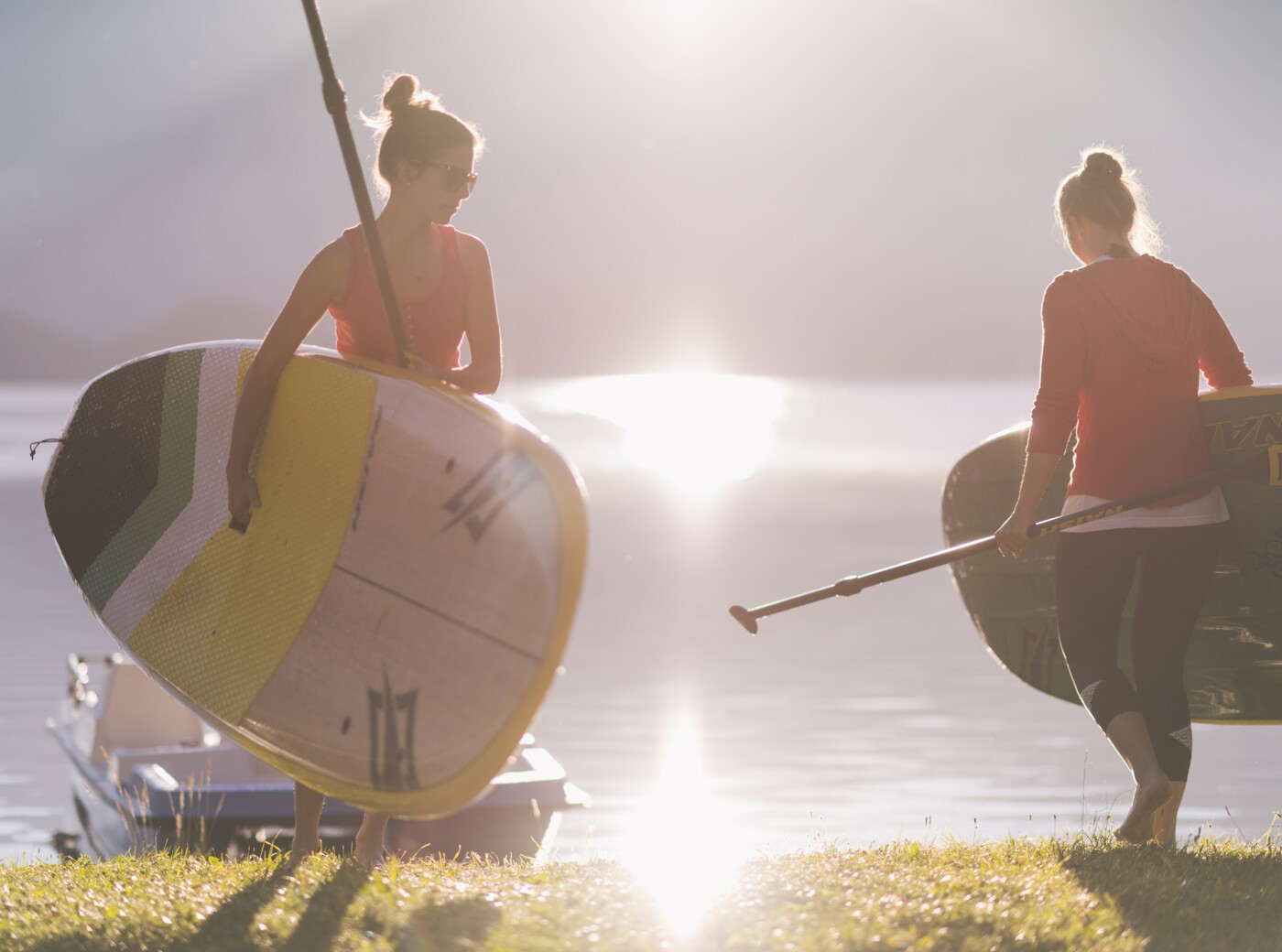 Für Fabia, Seraina, Simona und Felicitas gehören die SUP-Erlebnisse wie selbstverständlich zum Engadiner Sommer. Einmal wöchentlich treffen sie sich um 6.30 Uhr in Plaun da Lej beim Restaurant Murtaröl. Hier befindet sich die SUP-Vermietung. Boards mieten, umziehen und in See stechen. So einfach ist das am Silsersee, im Engadin.