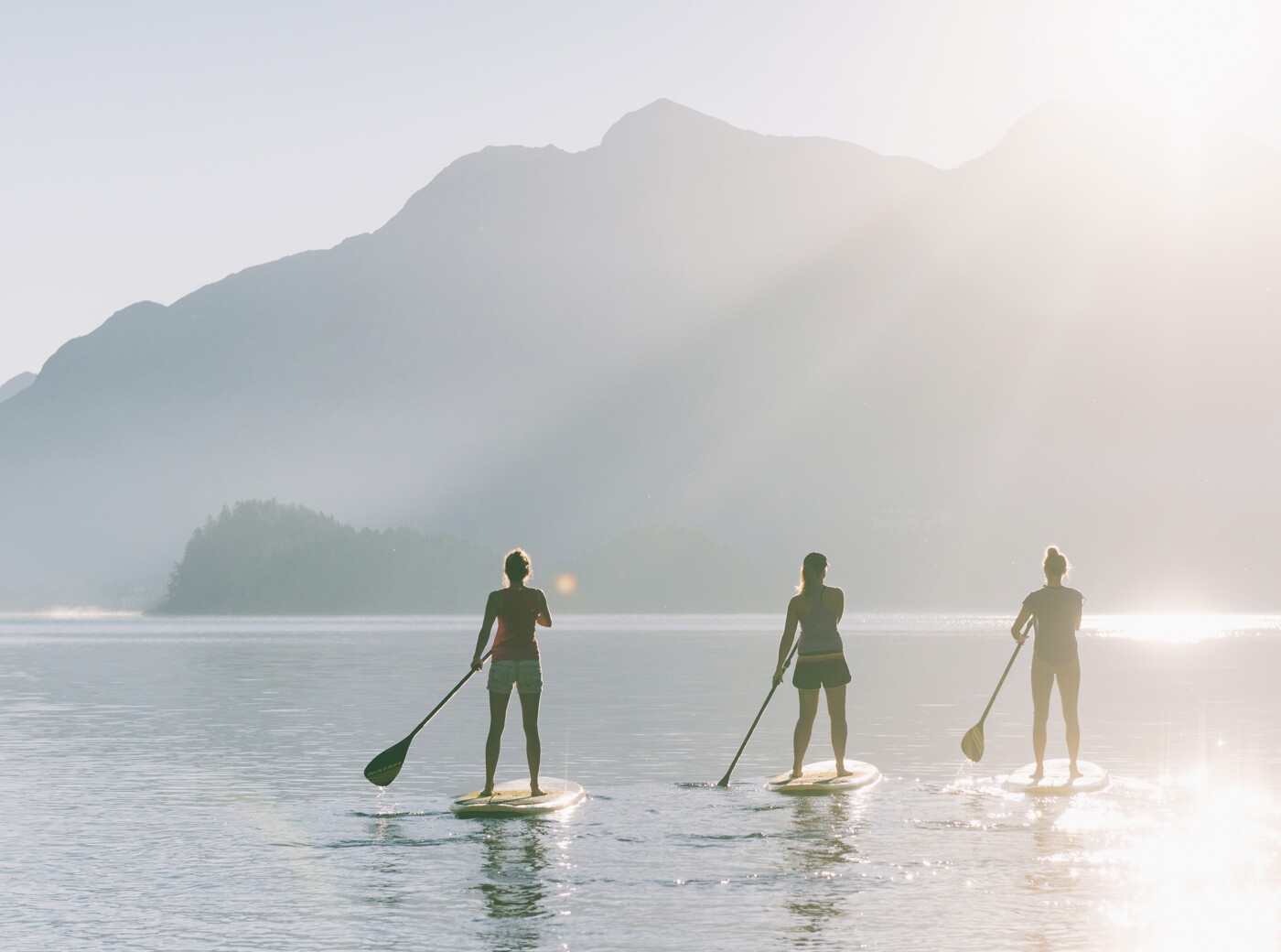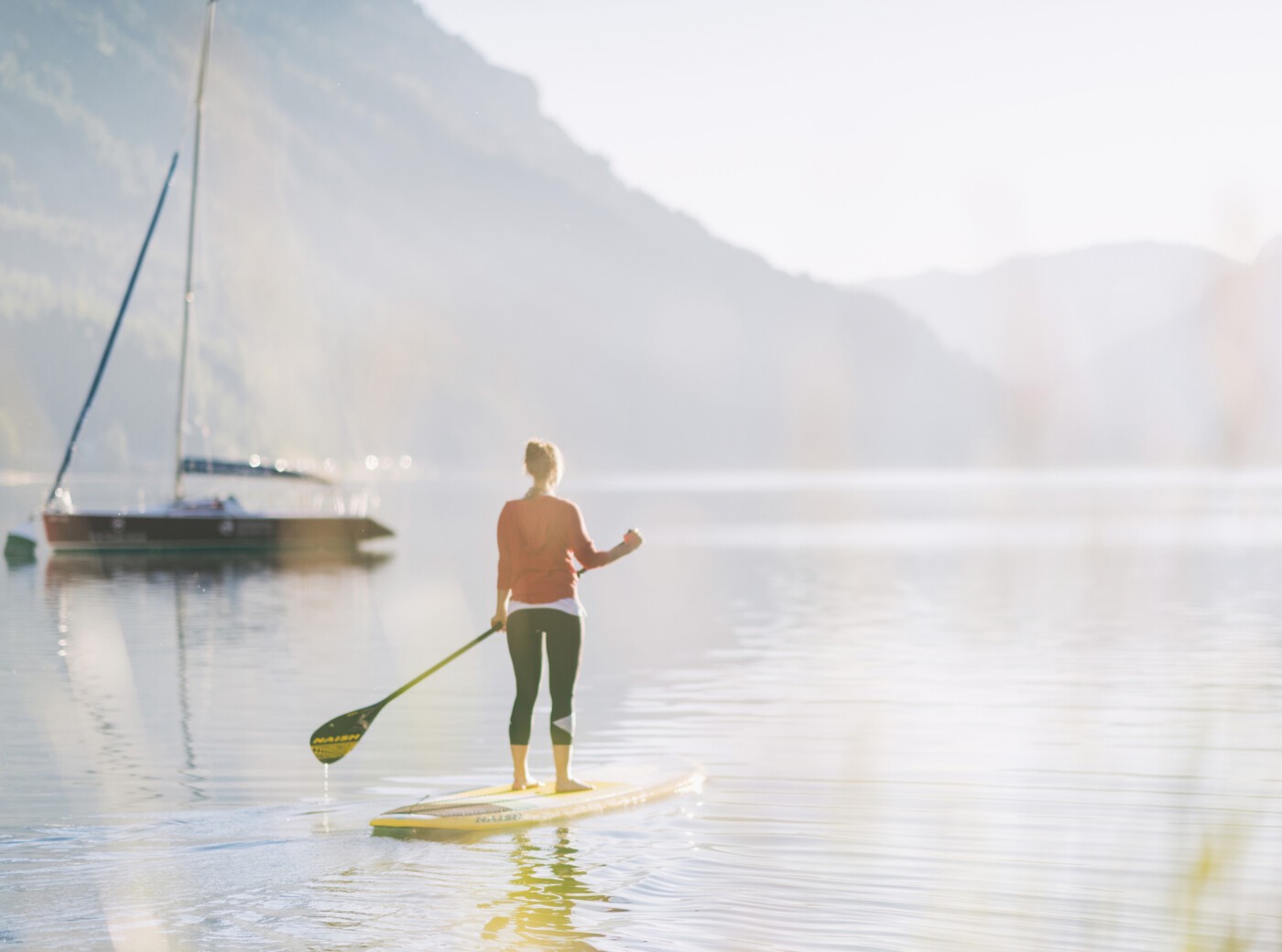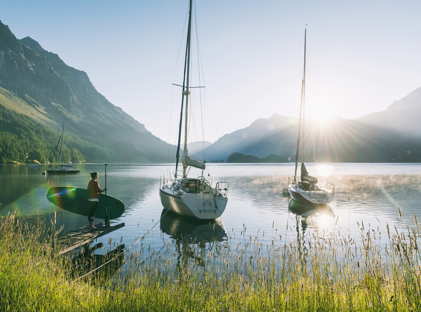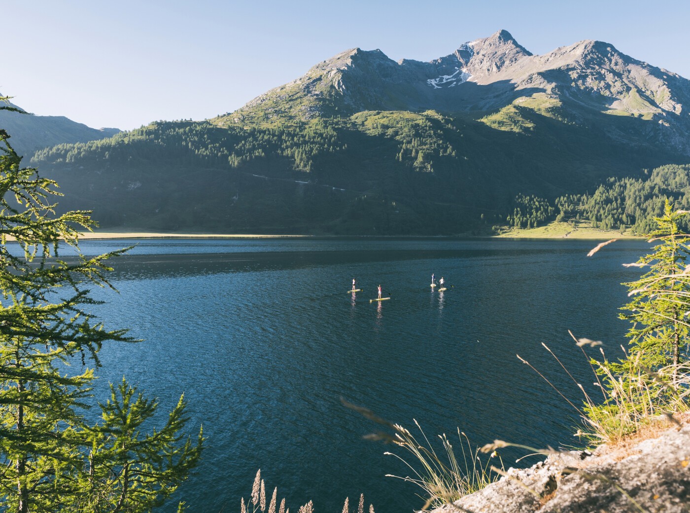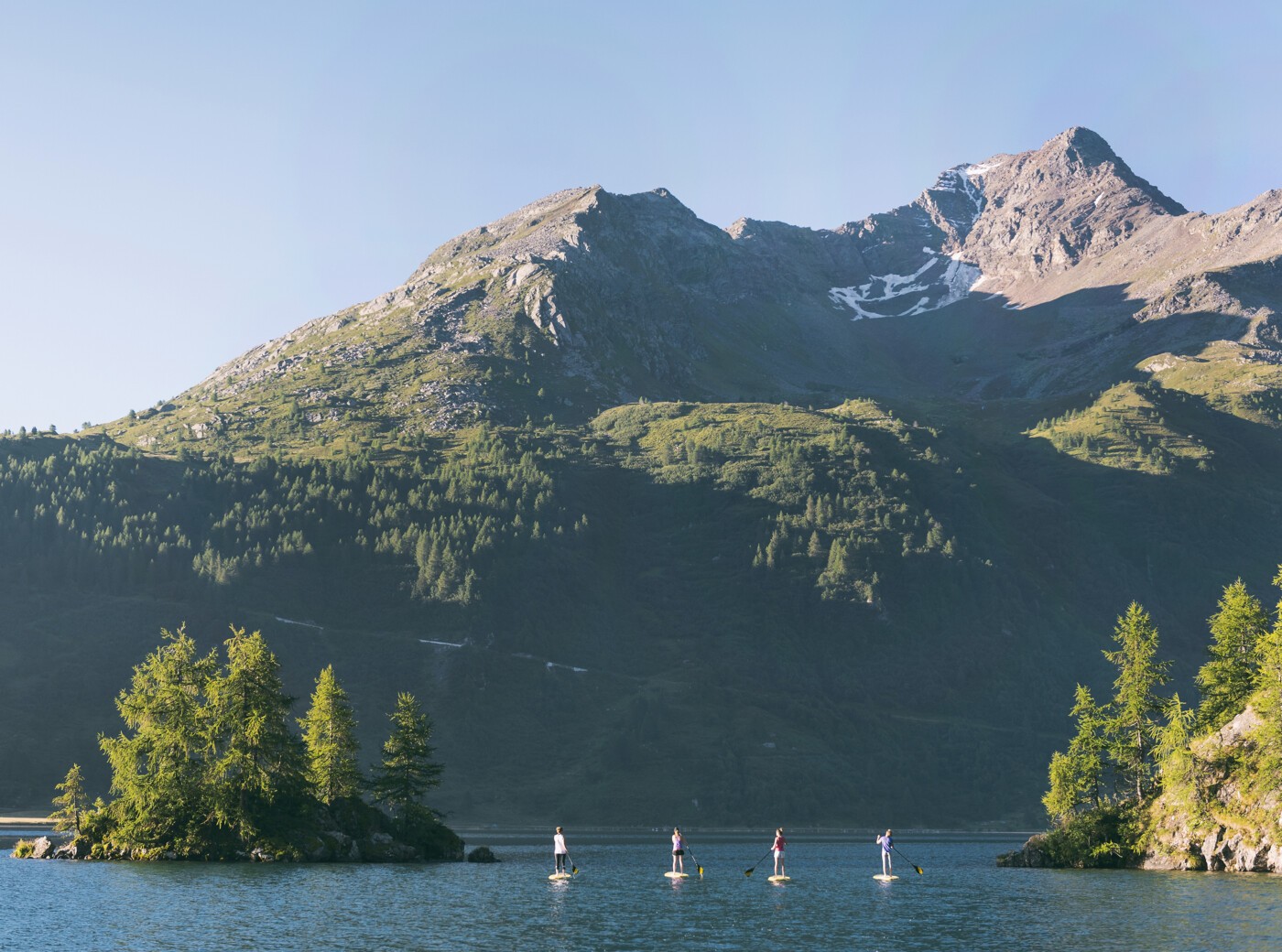 Je nach Lust und Zeit paddeln die vier Frauen quer über den See nach Isola oder nach Maloja. Dazwischen geht’s auch mal zur Halbinsel Chastè. Mal sind sie sportlich unterwegs, mal pausieren sie inmitten der gleissenden Pracht, um zu plaudern und die Sonne zu geniessen. Immer kehren sie voller Energie ans Ufer und in den Alltag zurück. «So ein SUP-Erlebnis auf dem Silsersee – das ist eine Wohltat für Körper und Geist.» schwärmt Seraina und startet in den Arbeitstag.